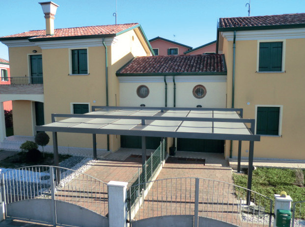Speedy veloce e facile da assemblare ed installare. Si tratta di una pergola interamente in alluminio verniciato a polveri, formata da colonne e traversi, tutta la viteria è in acciaio Inox. La struttura è fissa e la copertura può essere fatta in tessuto acrilico, pvc o con lastre di policarbonato.